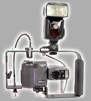 Flash Bracket. Here's one that surrounds the camera! The Coolpix sits inside a loop of extra strong aluminum that provides attach points for flash units making horizontal or vertical images.