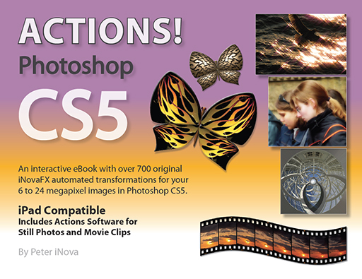 12/4/10 UPDATED 12/18/10 EBOOK PLUS ACTIONS CS5. I wish it were possible to show you what this eBook is like on your computer... WAIT! I CAN! Click on the eBook cover and you will instantly be looking at a Way bigger than these sample thumbnails: Now includes every page all pages of every chapter. The one you buy is 284 pages, and it can be viewed up to 600% enlargement, but you'll get the idea from this file, even though it only tolerates about 200% enlargement on most pages. A photography eBook should show you its images with maximum clarity. That's our opinion. Now that the Actions eBook is iPad2-friendly, you can read it anywhere. In the loo or Timbuktu. Over 700 Actions at final count. Nearly 60 of them are for movie files. Interactive links all over the place. And you can NOT beat the price.